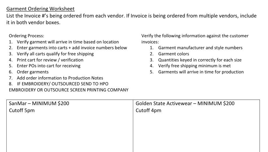 Orders with garments from multiple vendors are an edge case. Most orders have one garment type and one vendor. For the more complex jobs, keep them in their own window – or group them with the vendor that has the most garments for that job. Take notes on these jobs – they add road bumps to the ordering process.