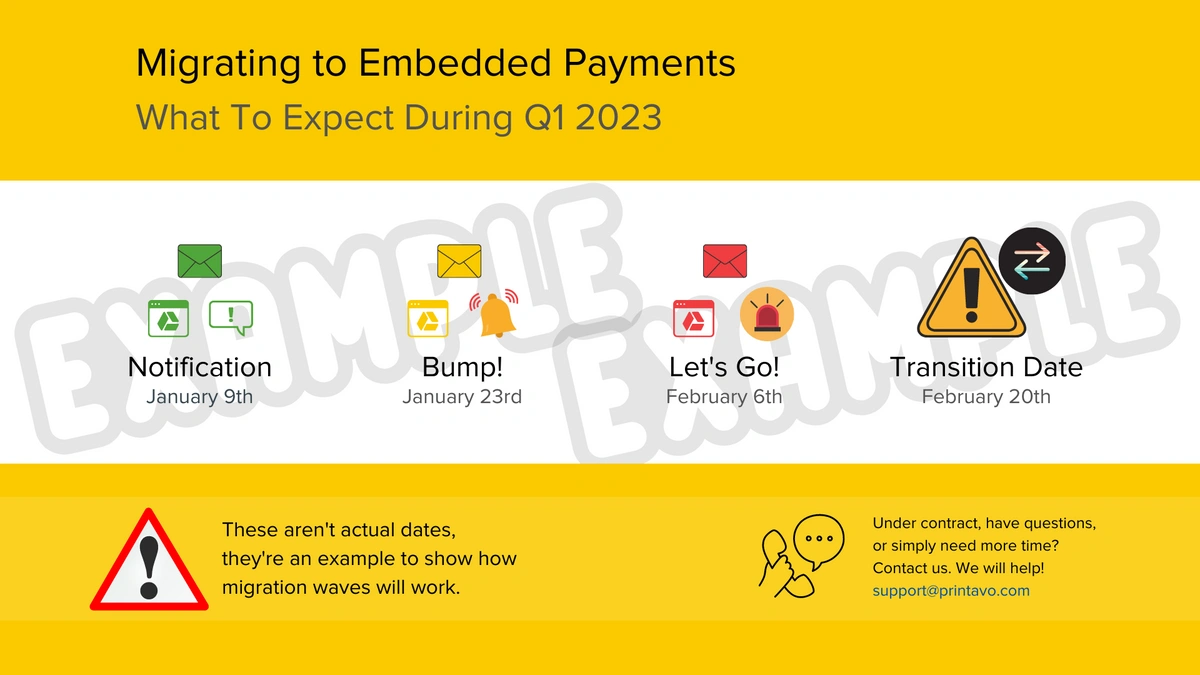 We have begun notifying shops that signed up prior to Q3 2022 and have not yet made the switch to Printavo’s embedded payments about when they will need to migrate to our embedded payment platform.